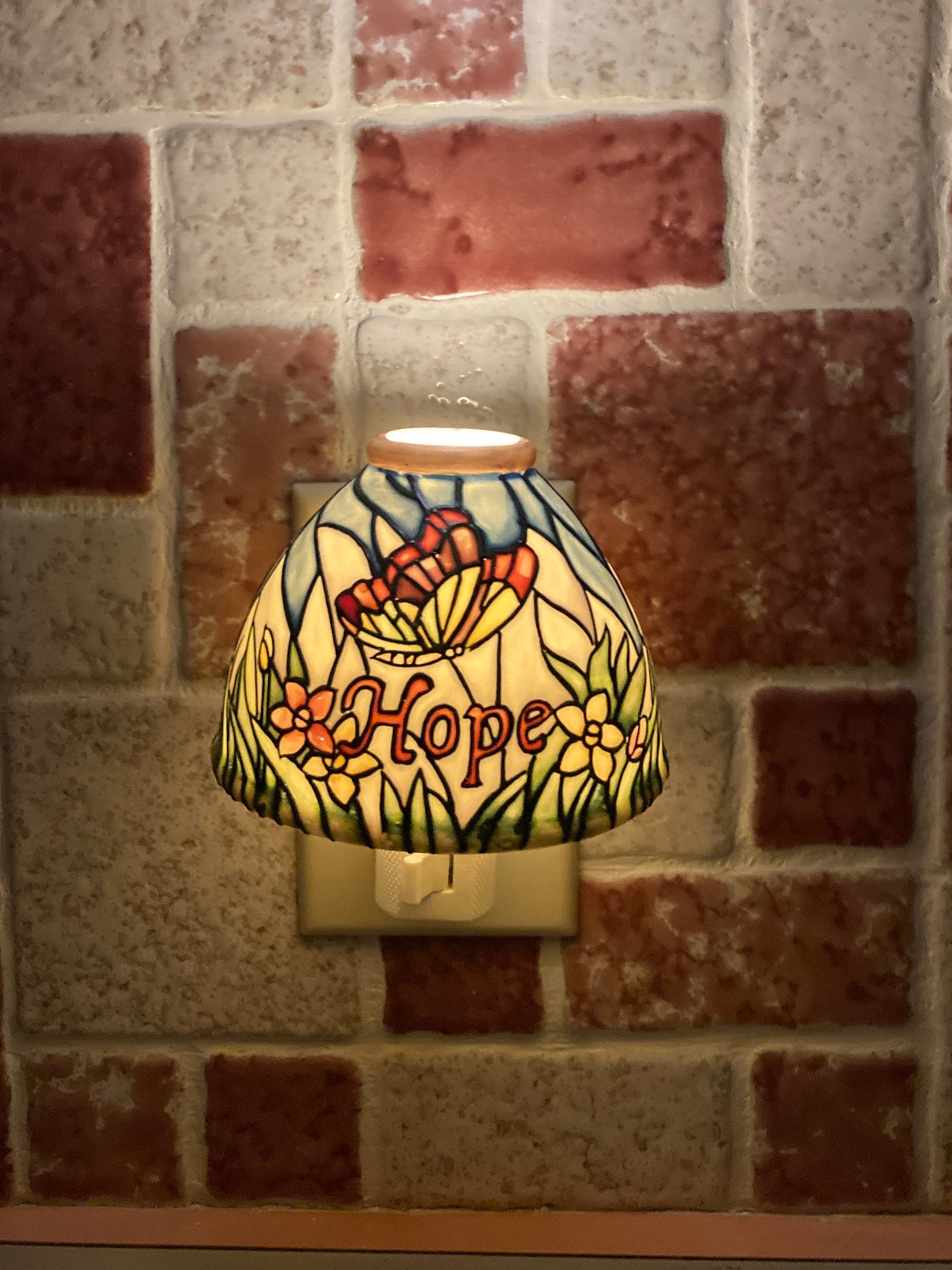 The bulb burned out last week. At which time I said “I have more bulbs.” And promptly replaced it, so Hope could shine again. I will always have bulbs for this night light. It was from my parents’ kitchen, and now shines in mine. It reminds me of many things and I regularly stand in its presence to ponder them.